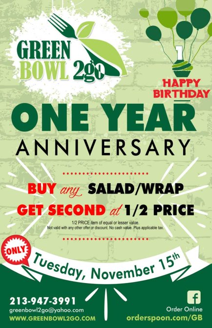GREEN BOWL 2go Marks Its One Year Anniversary on Tuesday, November 15, 2016 with a Special Offer: Buy Any Salad/Wrap and Get a Second for Half Off All Day.
