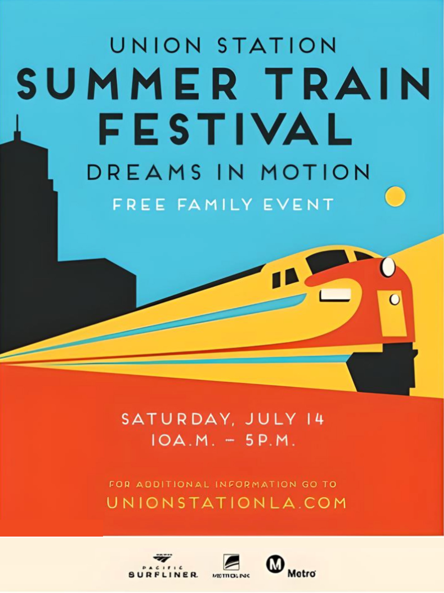 Save the date for Los Angeles Union Station's Train Festival 2025: LA's Spirit in Motion! Presented in partnership with Metro, Amtrak, Metrolink and other organizations, Train Festival will be a dynamic celebration of Southern California’s rail heritage and future. Designed for everyone from daily commuters and rail industry professionals to train enthusiasts, historians, and architecture fans, the event will transform Union Station into a vibrant hub of activity.