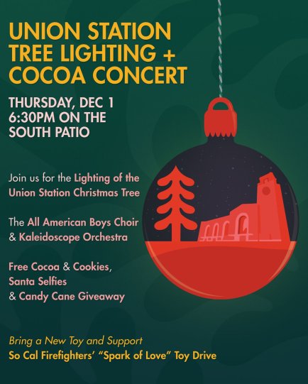 Union Station will summon the sounds of Christmas with the Annual Tree Lighting on the station’s South Patio, accompanied by an extraordinary collaboration from the renowned All-American Boys Chorus and L.A’s Kaleidoscope Chamber Orchestra